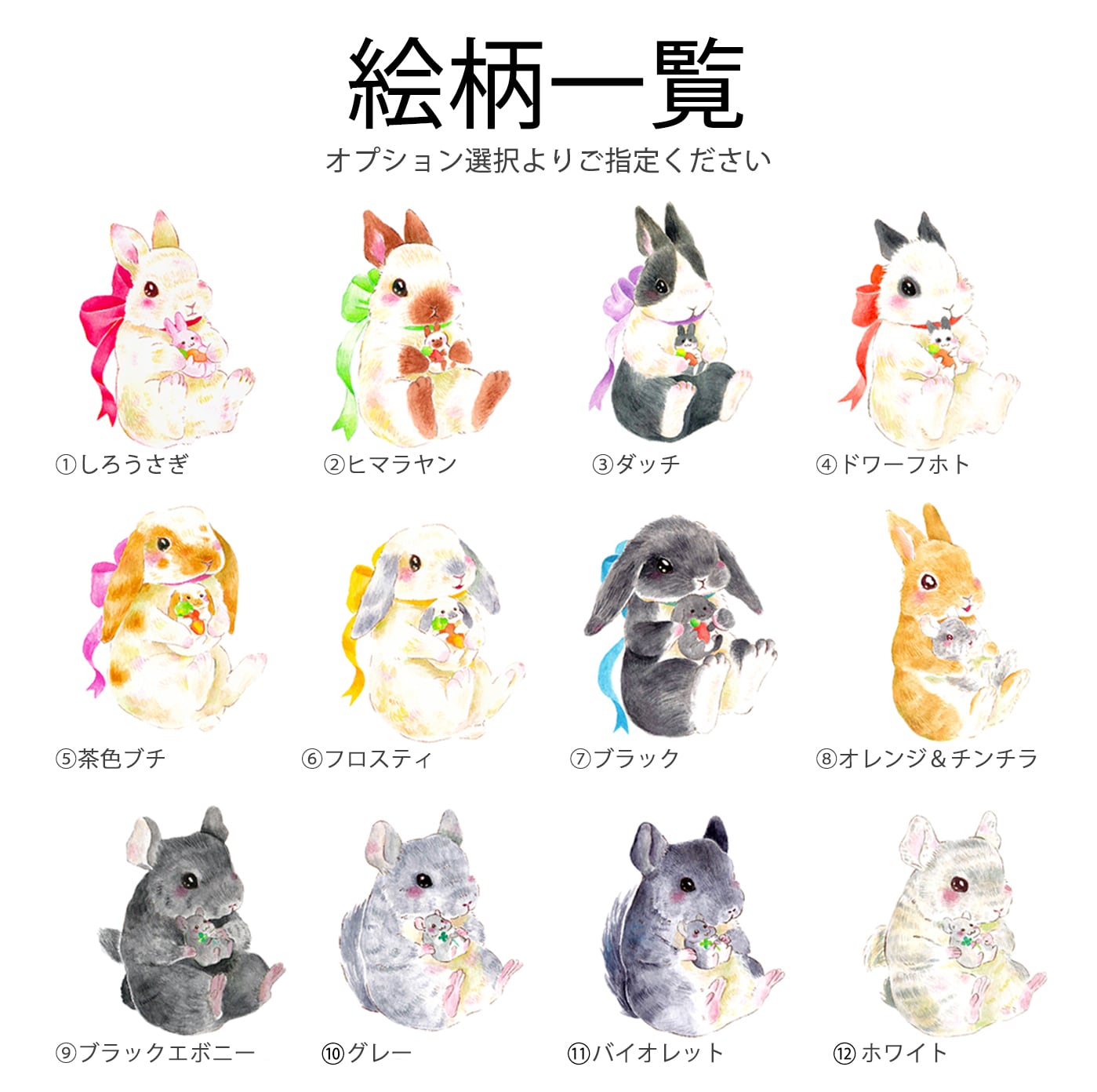 うさぎチンチラのイラスト雑貨【カラー・リボンボン】