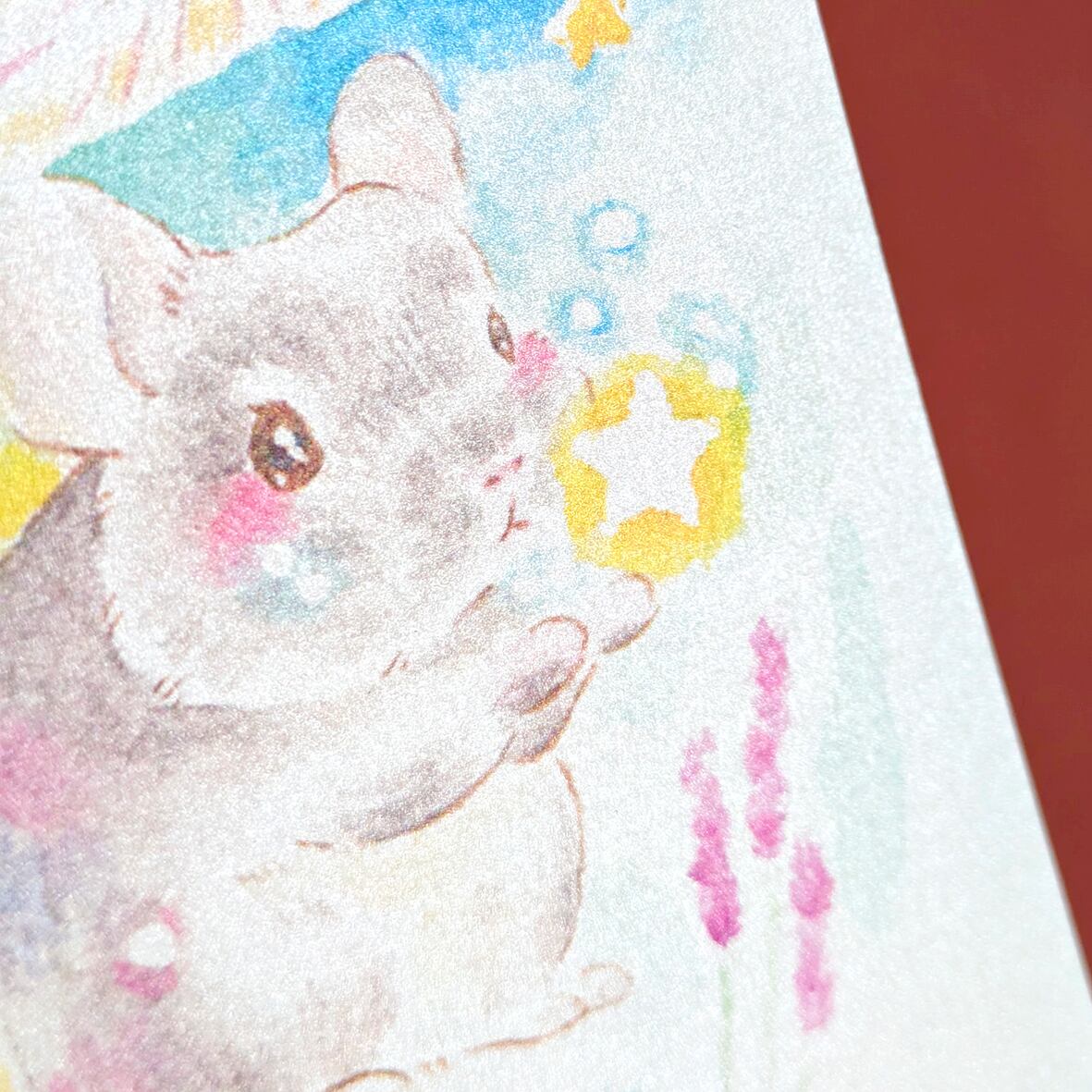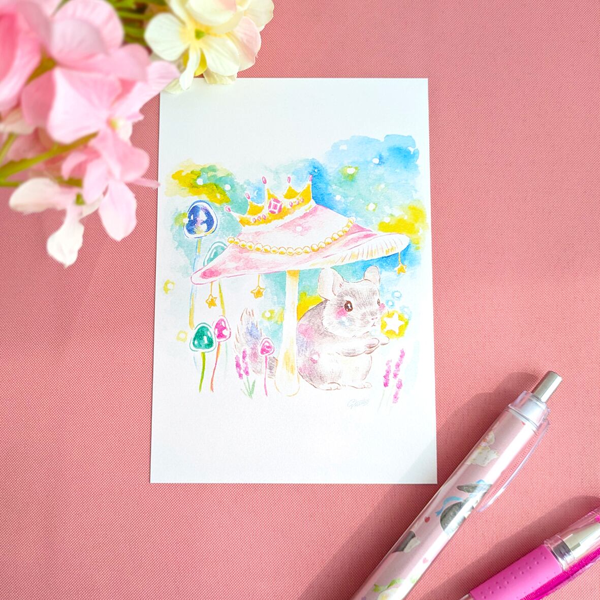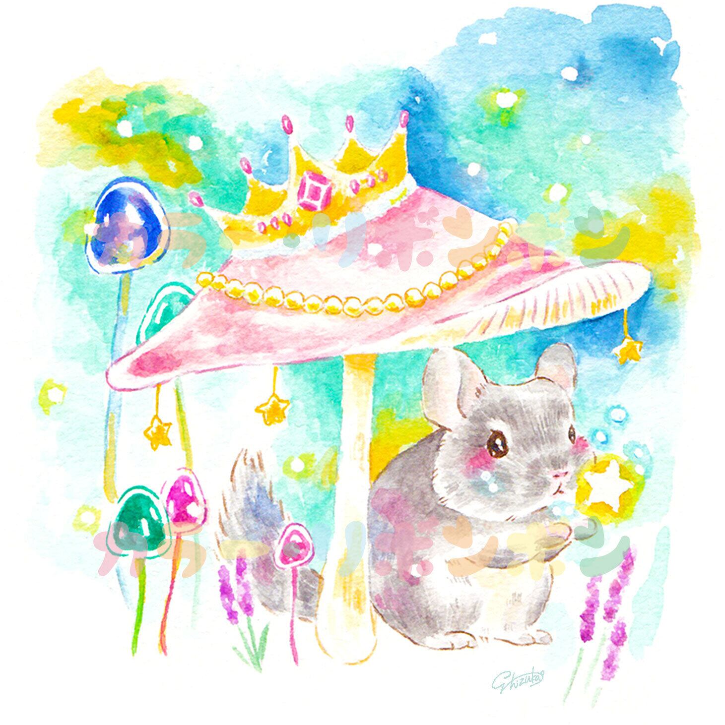 水彩で淡く、ふわふわもふもふなチンチラの可愛さを描いてます。